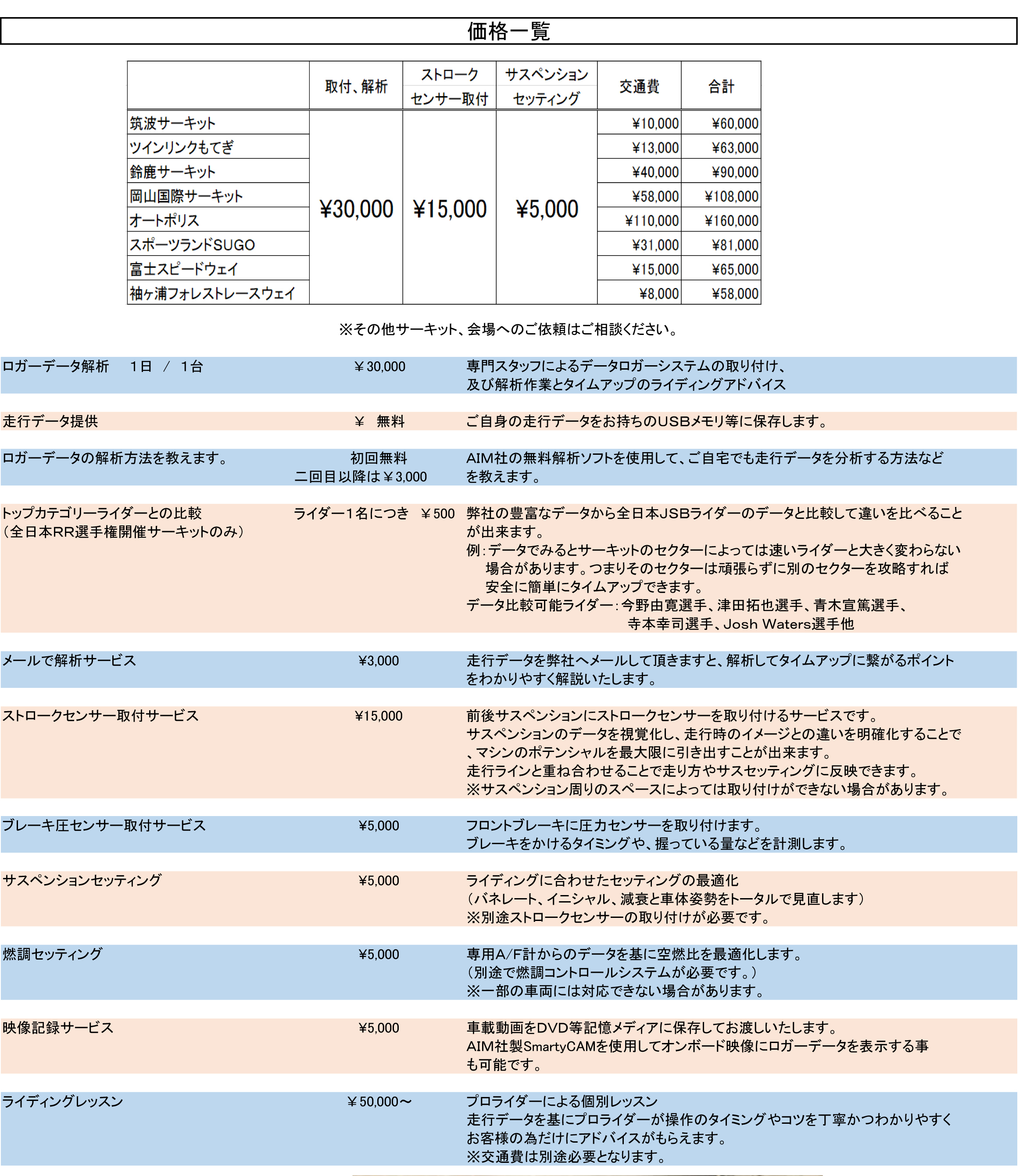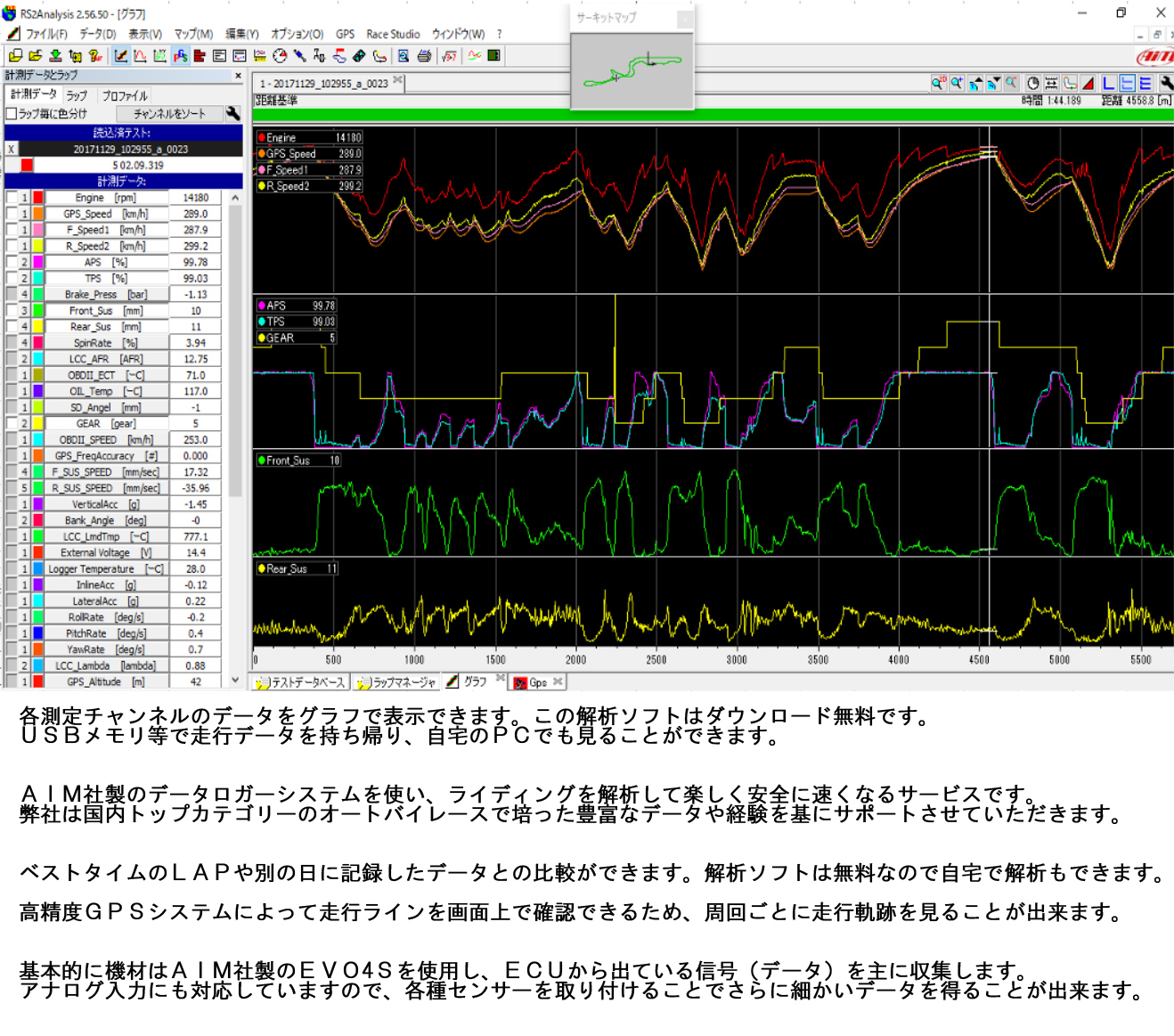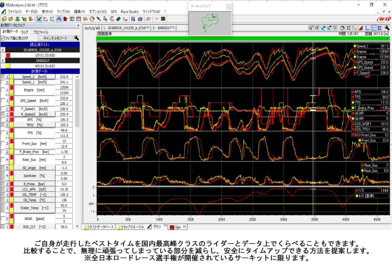 走ってなくても速くなれる! ご自身のライディングのすべてをデジタルデータとして記録。 詳細なグラフで簡単に比較。 『以前ほどタイムの上がり幅が少ない・・・。』『一生懸命走っているけどタイムが・・。』 感覚を頼りに走行していると、ついつい無理をしてしまいがちです。一度データを確認するとウィークポイントが明確になるので安全で確実にタイムアップが可能です。